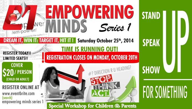 Again, need I say more? Your child from the time they are born to university bound, needs all the help to deal with school, high performance in education, strategies for staying focused, direct help and counseling, dealing with peer pressure, bullying, self-esteem issues, training on making good decisions, planning for future careers. We will have a special guest speaker, young adult, sharing his real life experience on the perils of following the wrong crowd and how to bounce back. There is something for parents and children from 5 years old to high school. Come, take advantage, only $20 per person for a valuable experience worth more than that! Bring everyone, space limited. Register today!!!
